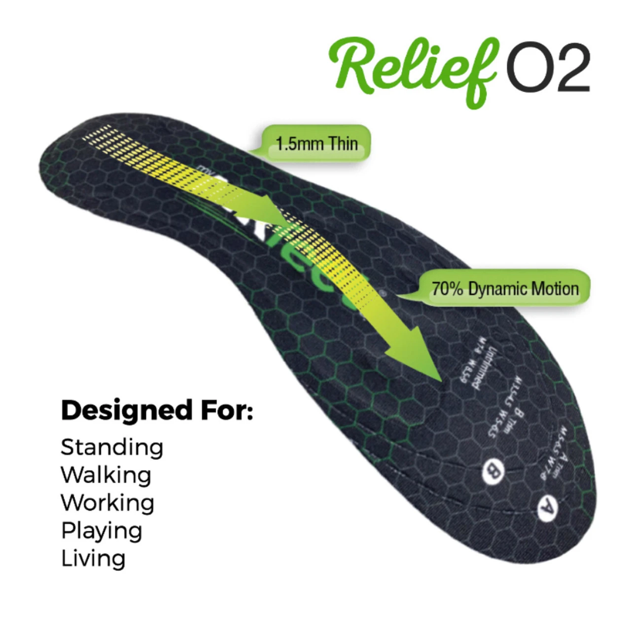 Relief O2 Insoles are the latest AIRfeet “feather Light” design that massage the foot muscles providing life changing results at a Super Thin 1-2 mm when compressed. Multi Patented design made to fit all footwear. – just slip them right in. Maximum Relief for ALL daily living, activities and working environments