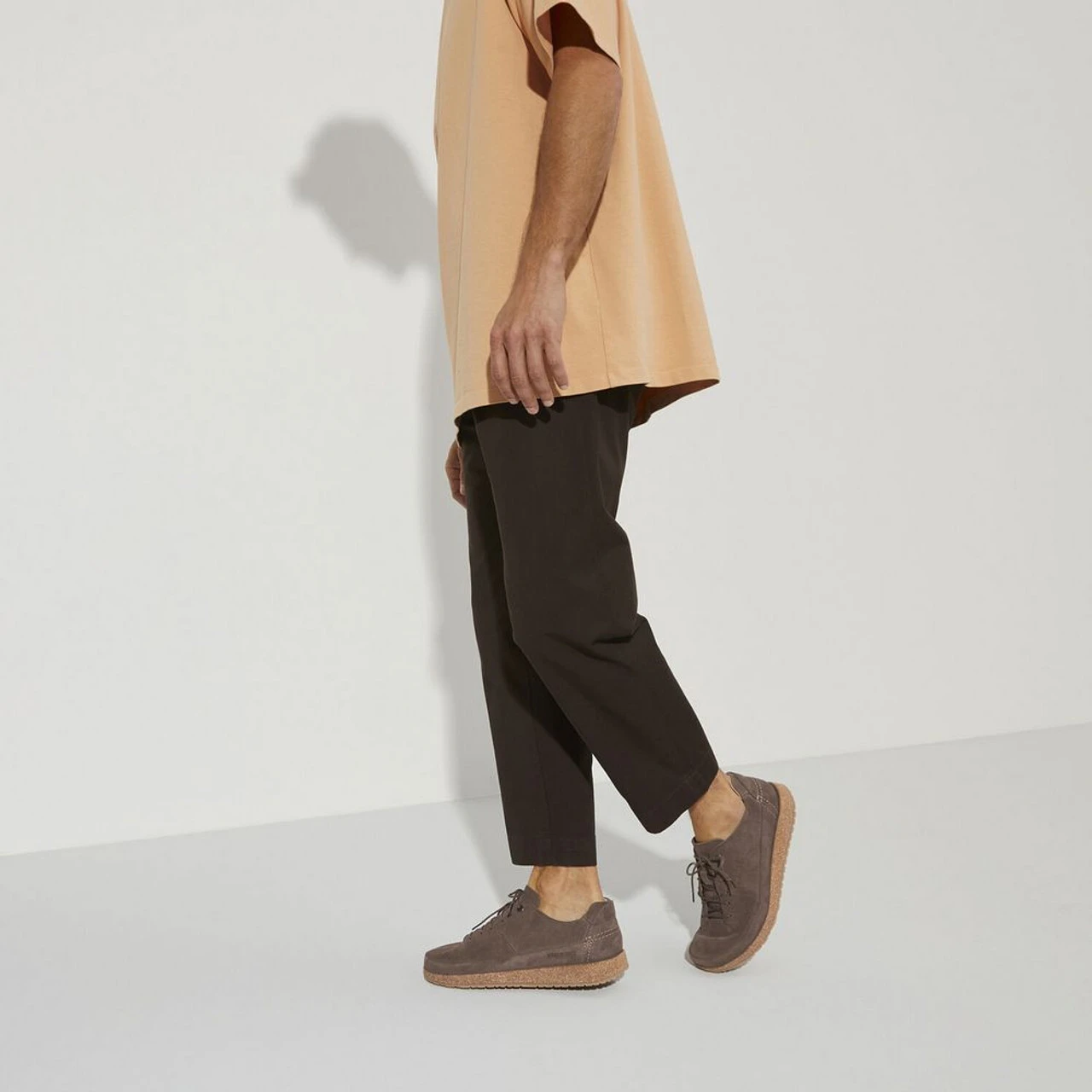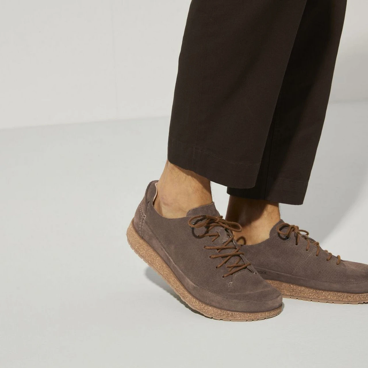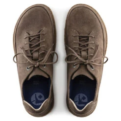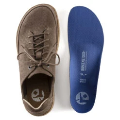 Introducing the BIRKENSTOCK Honnef, the newest street smart shoe engineered completely around our the new Deep Blue footbed. The four part footbed includes a moisture wicking microfiber liner, cork and jute layers for optimum arch support and a PU base for added shock absorption and forefoot cushioning. The sporty lace up style is perfect for your most active days whether that’s all day around town or on your next travel adventure. The upper is made of perforated suede.