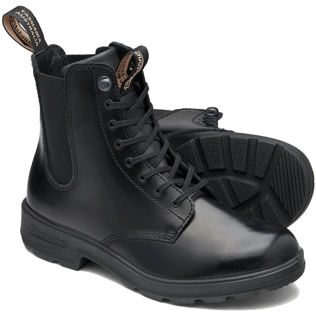 The #2219 Lace Up Gore boot in brushed, patent black leather, provides rugged versatility and an all-around statement piece featuring pull-on ease.