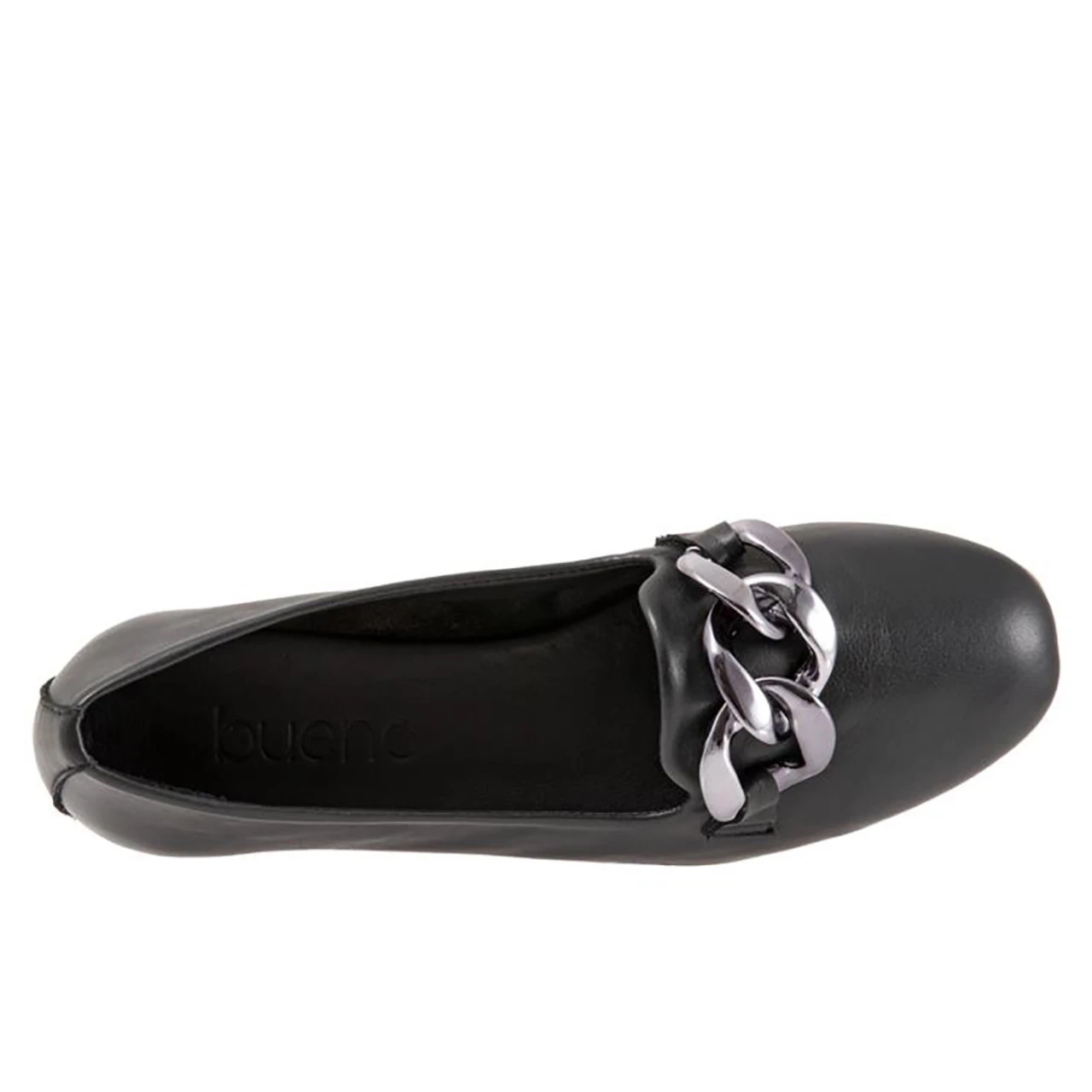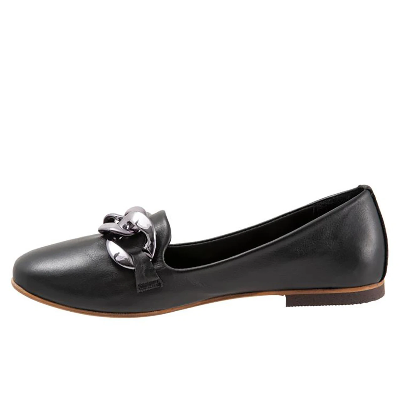 A large chain ornament adorns the vamp of the Aston flat with its low scooped sides and flexible sole.