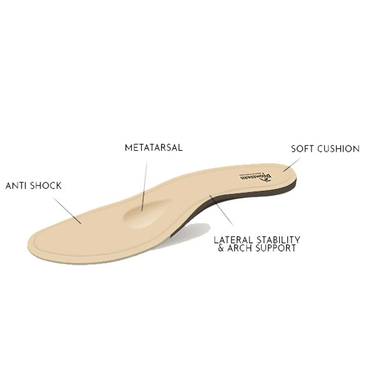 - High-density recovery foam never flattens, is built for lateral stability, arch support, shock absorption and metatarsal insert with soft cushioning to relieve pressure on toes
