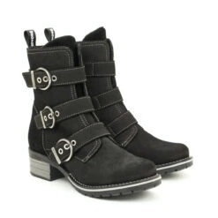 High ankle boot with adjustable triple buckle straps and zipper on the inside.