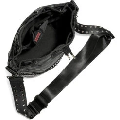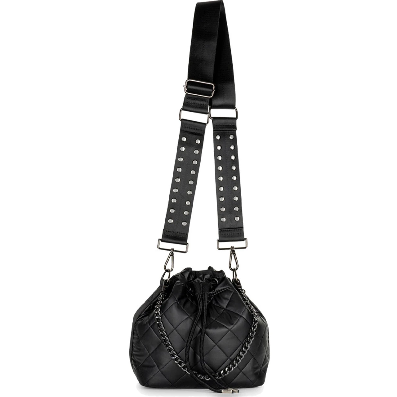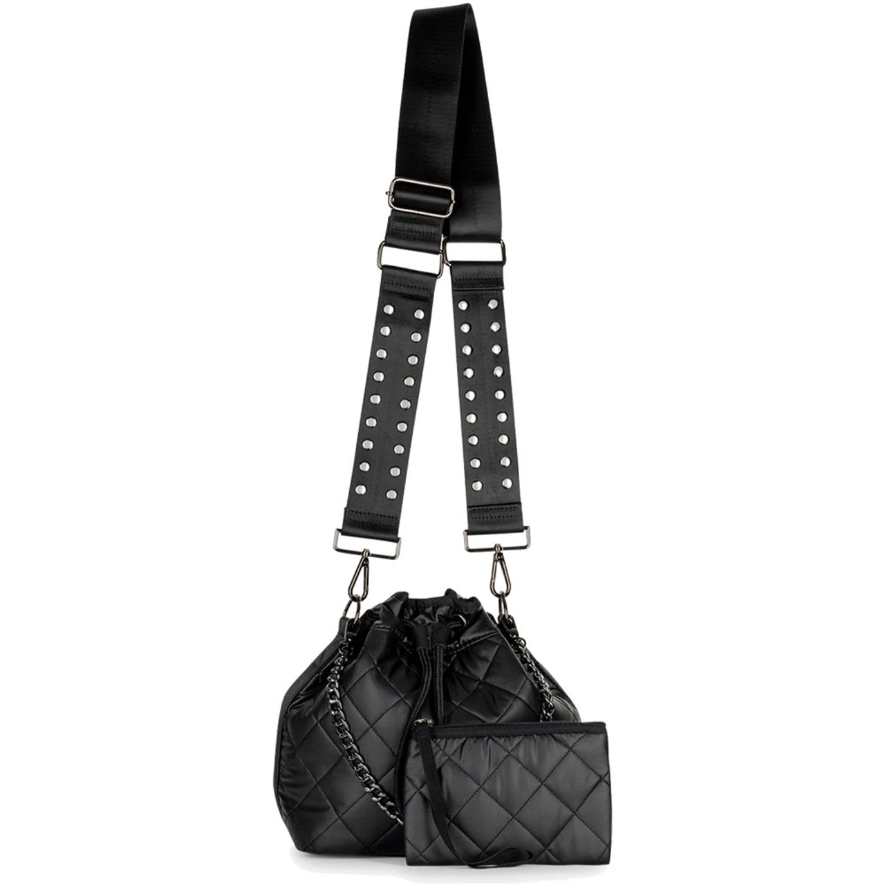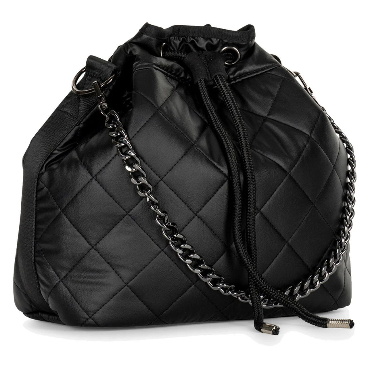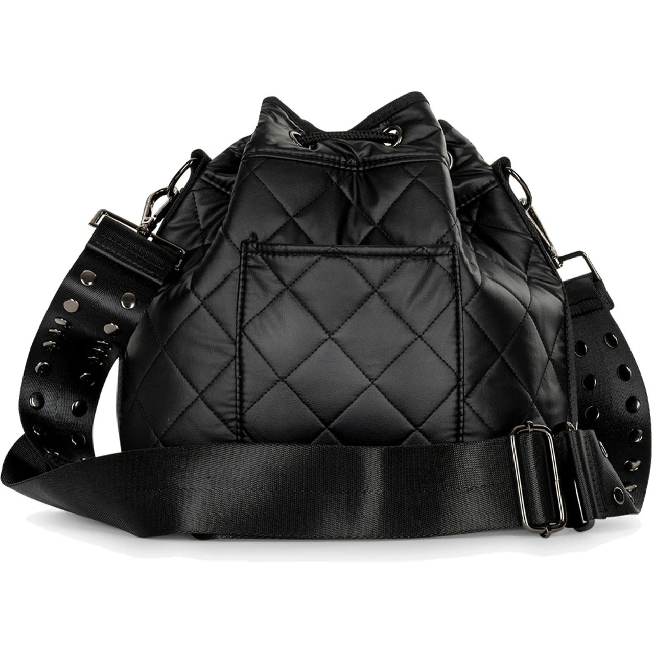 Black leatherette quilted puffer with a gunmetal studded strap and gunmetal chain strap.