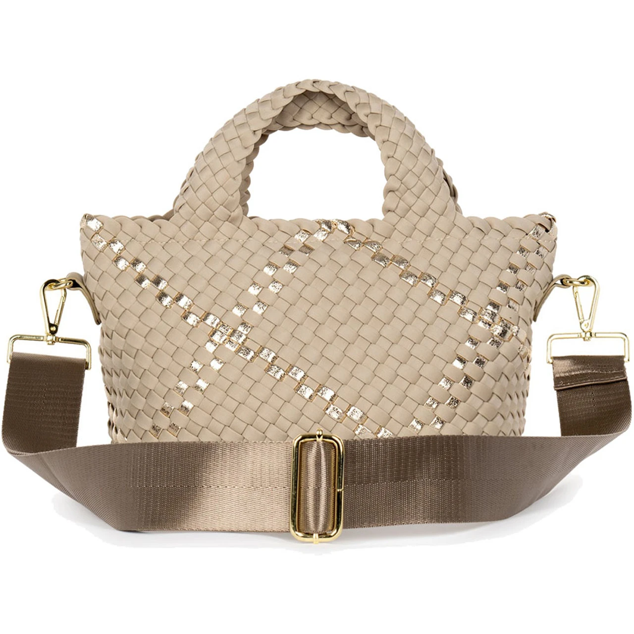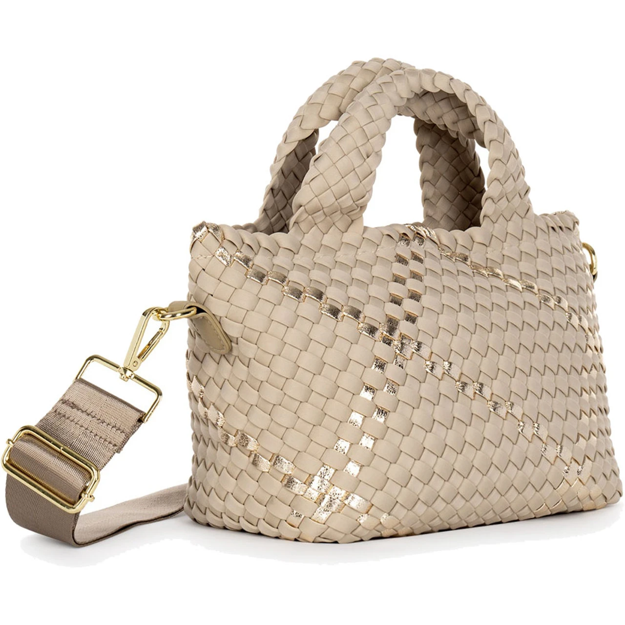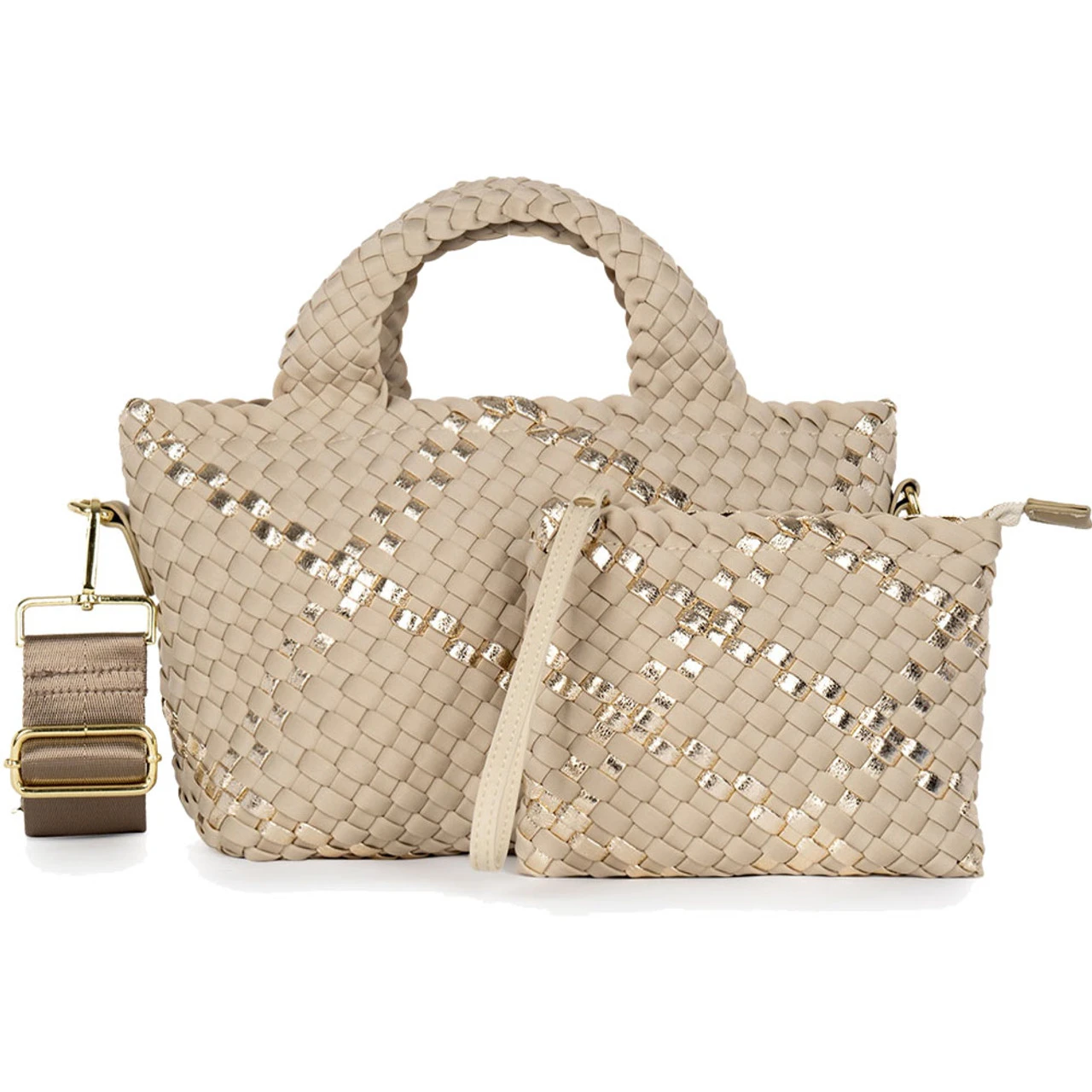 Small size woven tote featuring zip top closure, lined interior with 1 slip and 1 zip pocket.