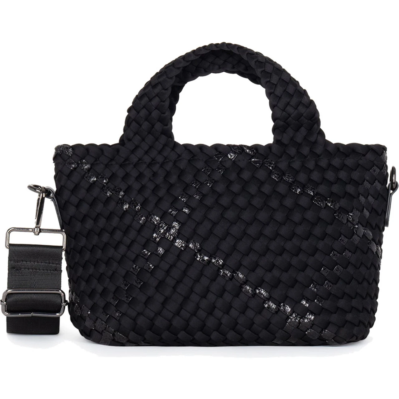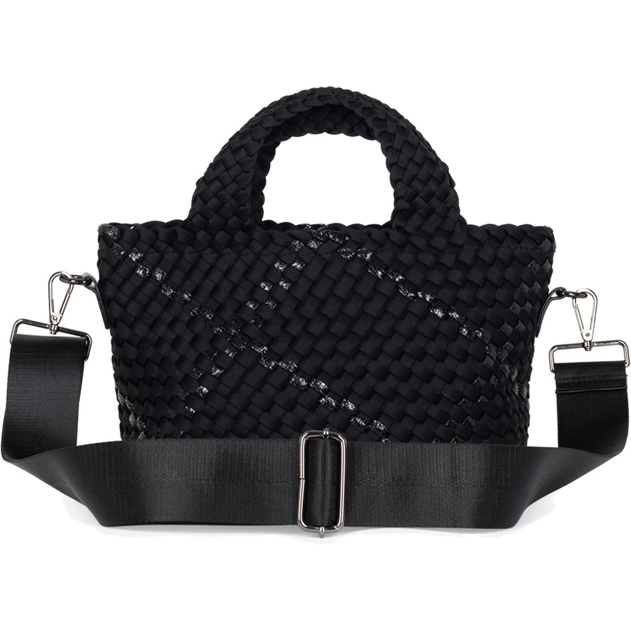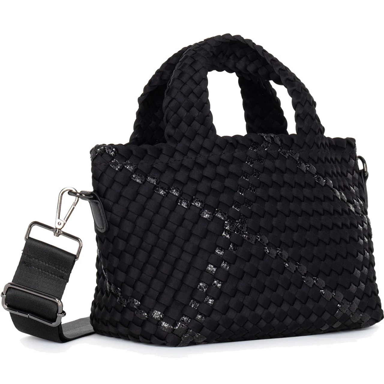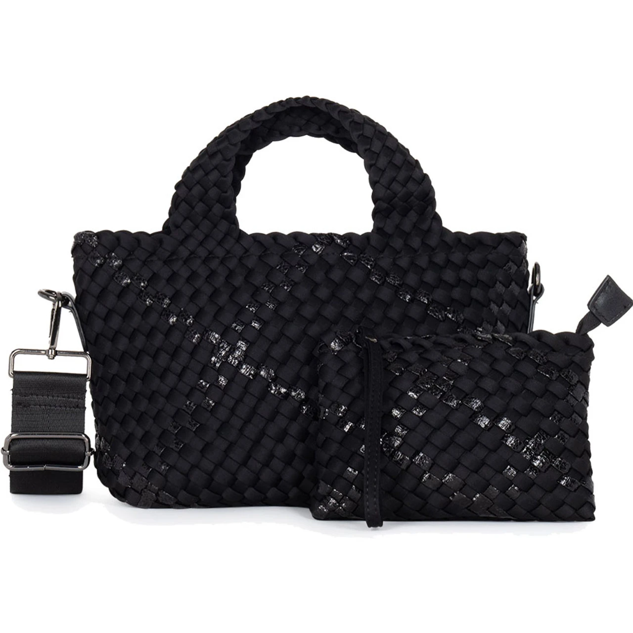 Small size woven tote featuring zip top closure, lined interior with 1 slip and 1 zip pocket.