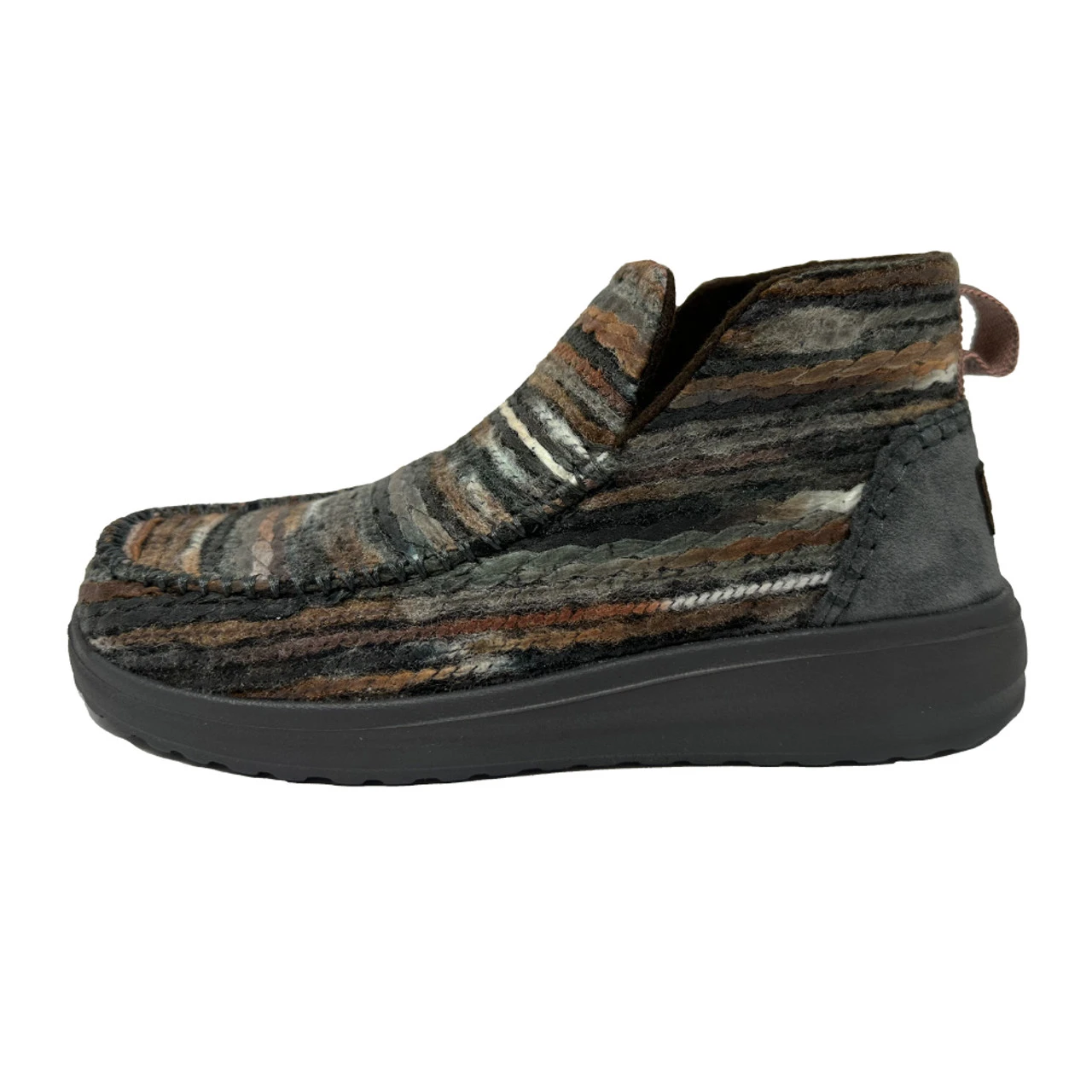 A soft, subtle bootie constructed in a soft wool blend with plush faux fur lining to keep your feet warm and dry all winter long. Finished off with contrasting, hand-stitched details and glitter-woven finishes throughout. Super cozy and lightweight.