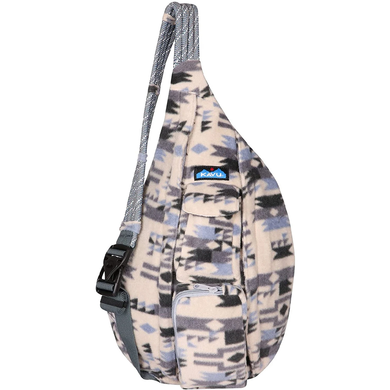 - Sling pack with adjustable rope shoulder strap and side release buckle, two vertical zip compartments, two key or cell phone pockets, padded back with KAVU embroidery.