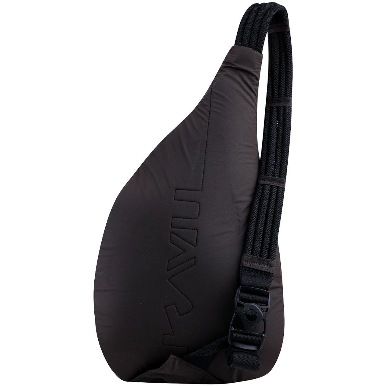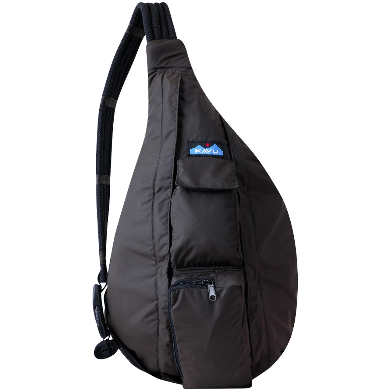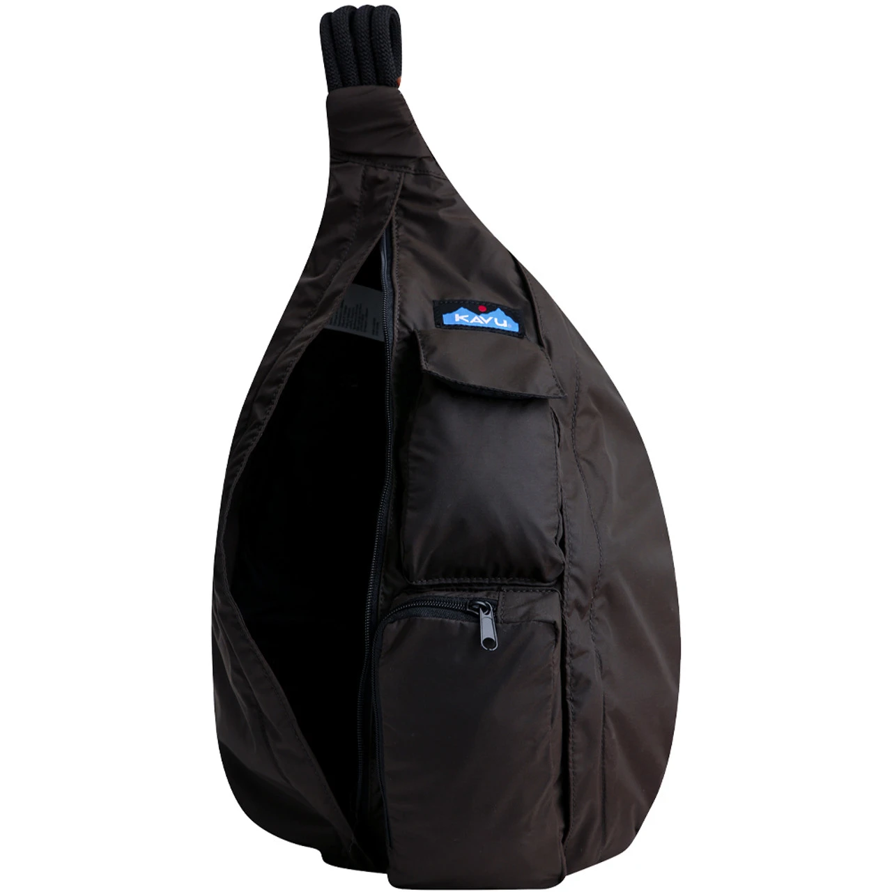Sling pack with adjustable rope shoulder strap, two vertical zip compartments, two key or cell phone pockets, padded back with KAVU embroidery.