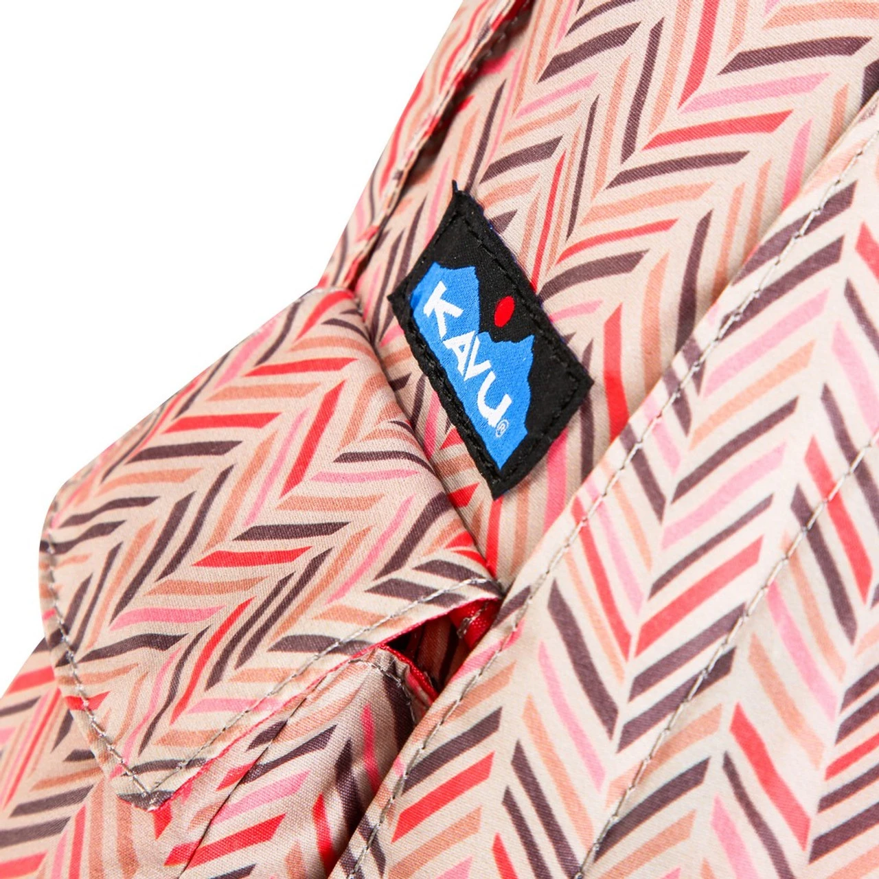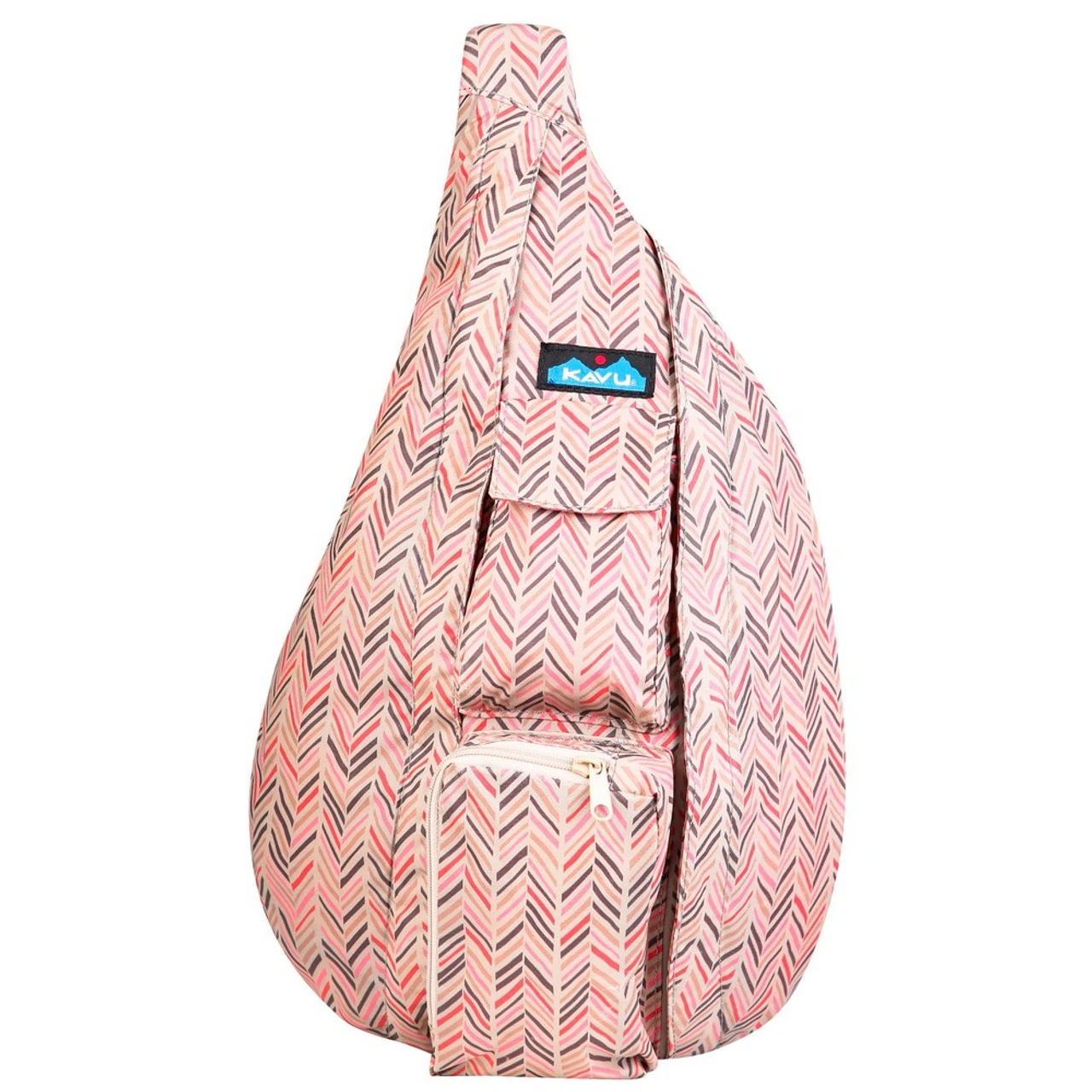Sling pack with adjustable rope shoulder strap, two vertical zip compartments, two key or cell phone pockets, padded back with KAVU embroidery.