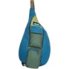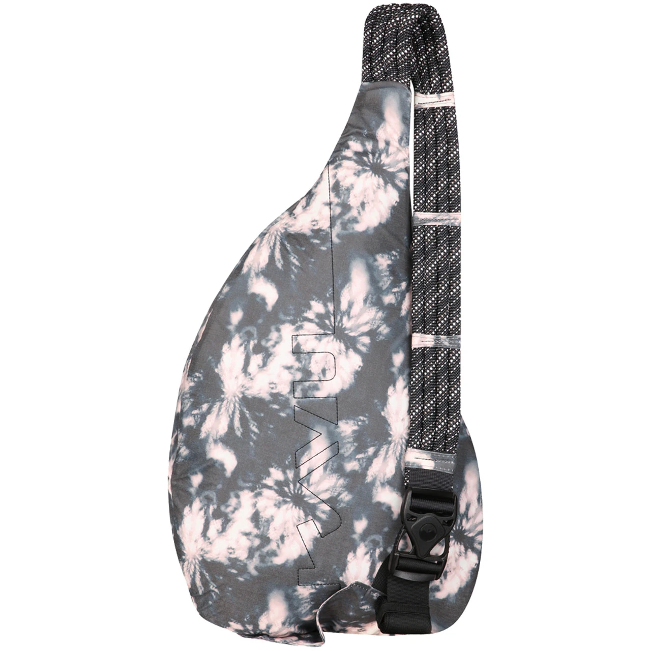Sling pack with adjustable rope shoulder strap, two vertical zip compartments, two key or cell phone pockets, padded back with KAVU embroidery.