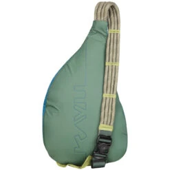 Sling pack with adjustable rope shoulder strap, two vertical zip compartments, two key or cell phone pockets, padded back with KAVU embroidery.