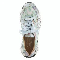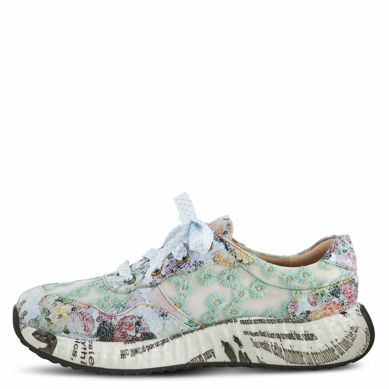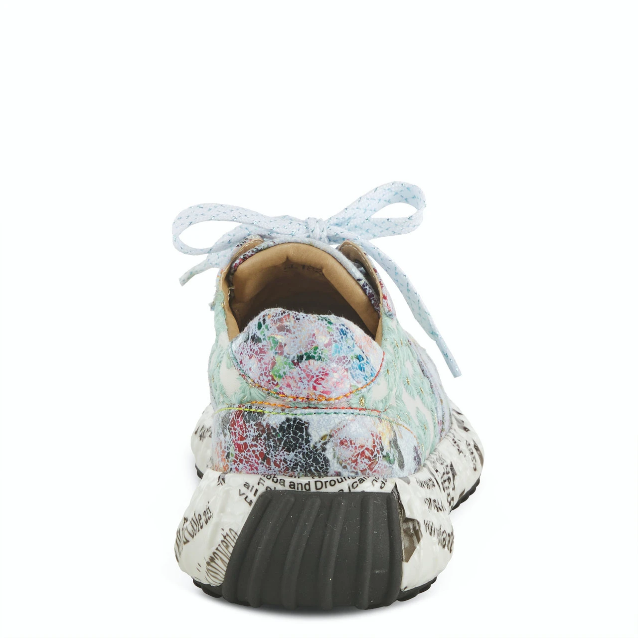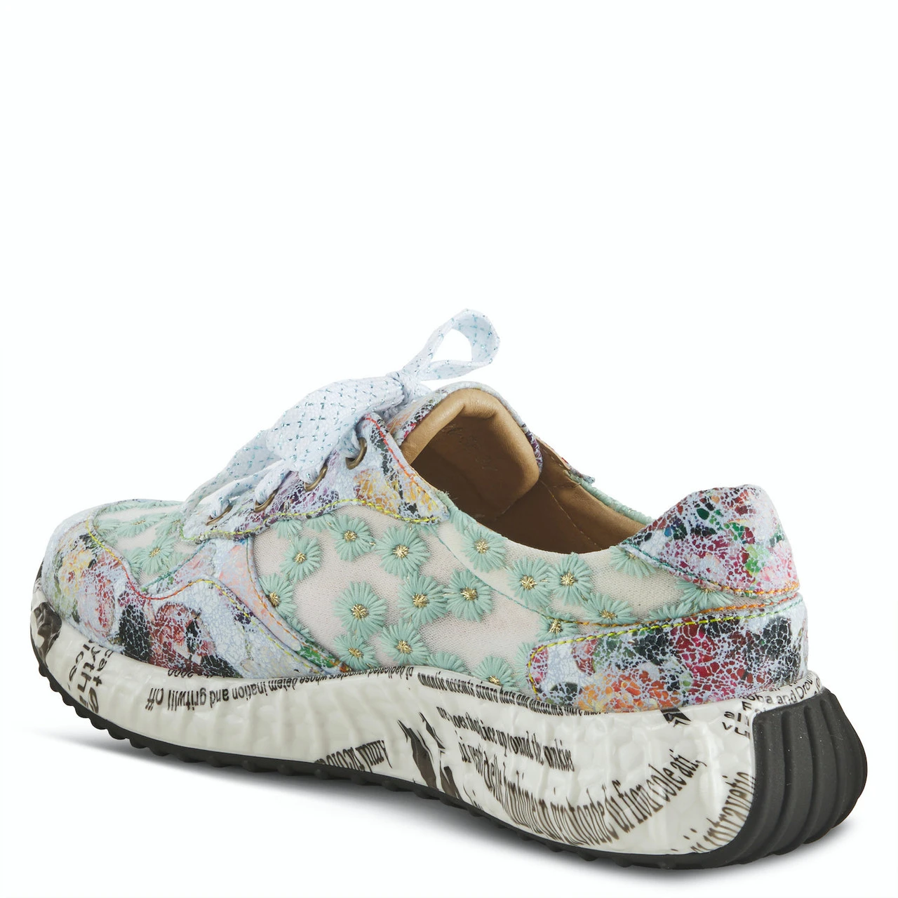 Push yourself out of your comfort zone with these daisymae sneakers. Following the the shoe are daisys and handpainted crackle floral patterns. The newspaper drop heel outsole and metallic laces spice up this sneaker.