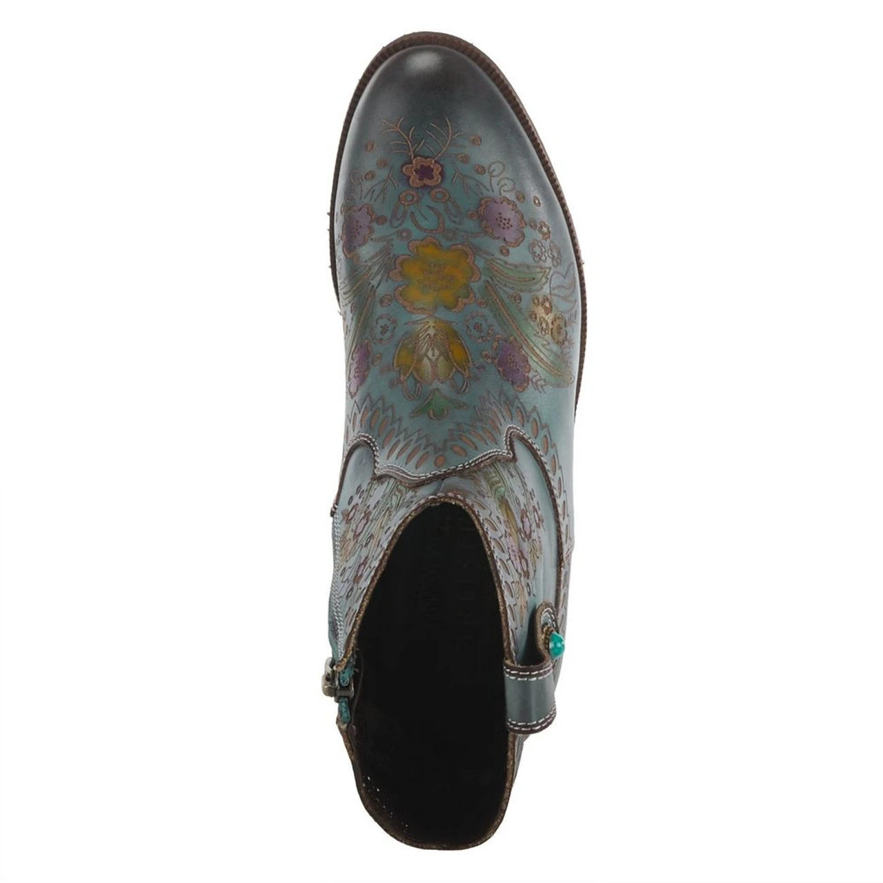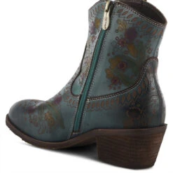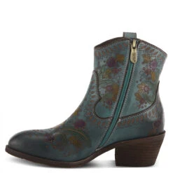 Premium hand selected leathers featuring hand embossed and hand-colored sprigs of wispy leaves and blooms. Fashion Cowgirl style boot with front yoke, outside cabochon embellished pull tab, and inside zipper.