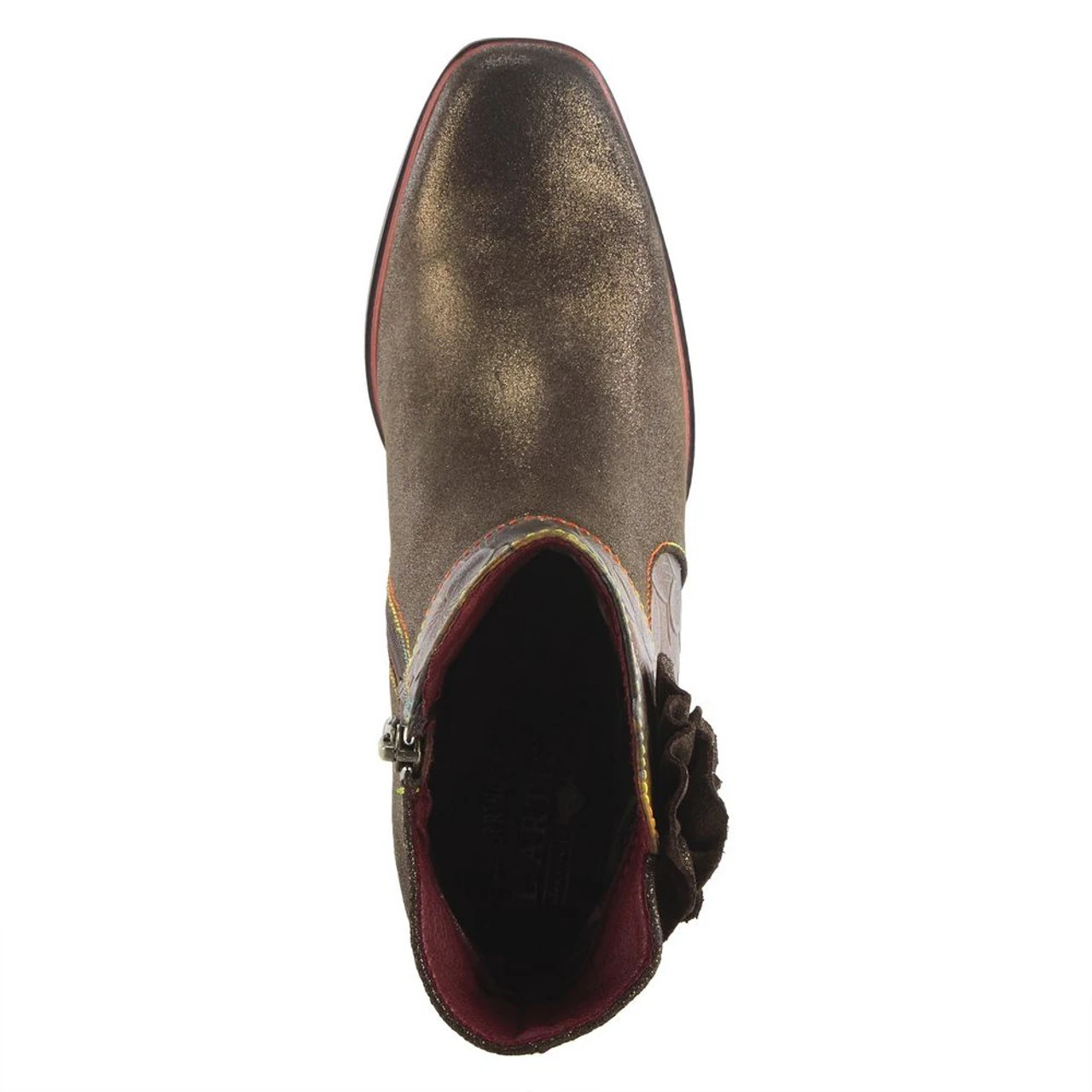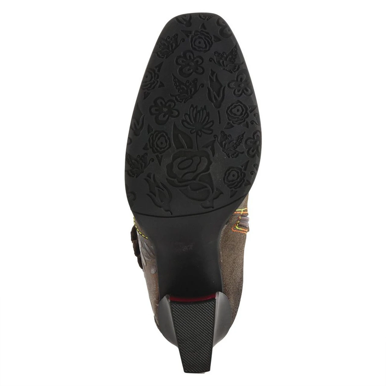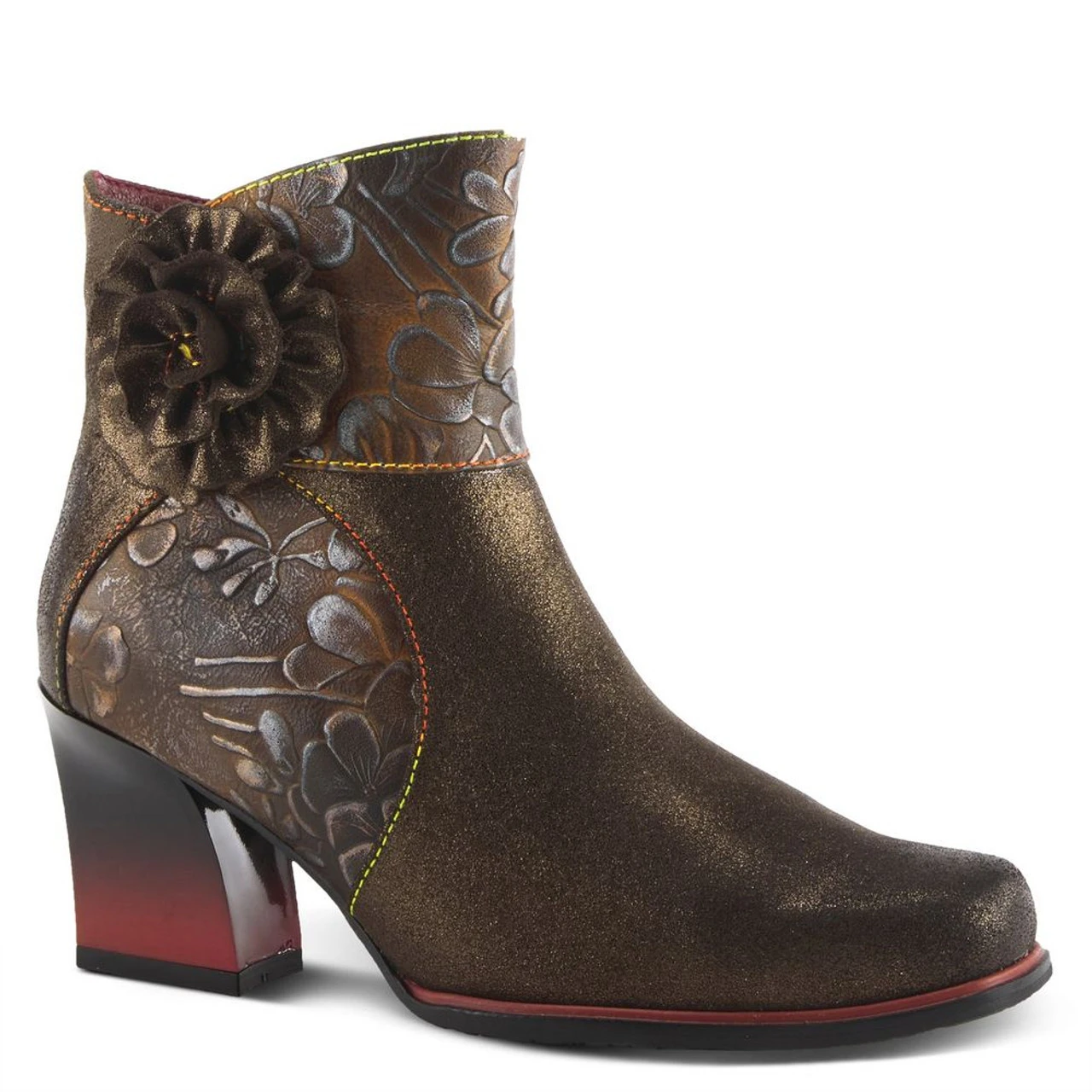This boot features a unique and eye-catching design with its architectural sculpted heel and brushed and burnished toe box. The outside decorative flower applique adds a touch of femininity to the design, while the hand-painted geometric multi-colored upper pattern creates a striking contrast against the dark heel and toe box.