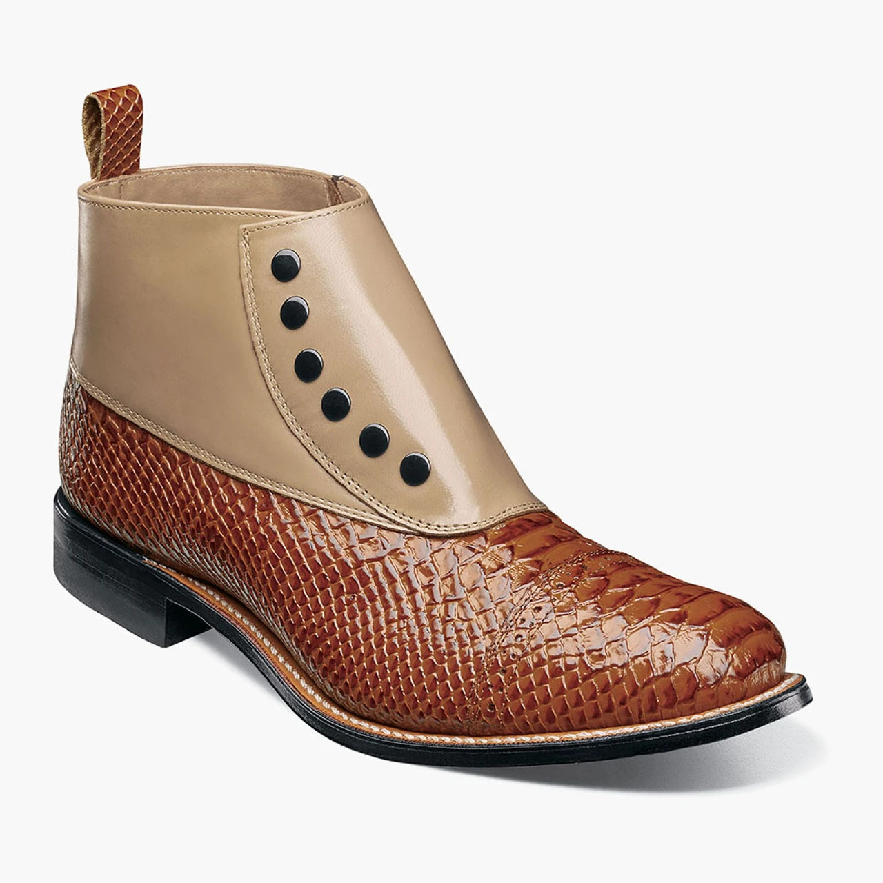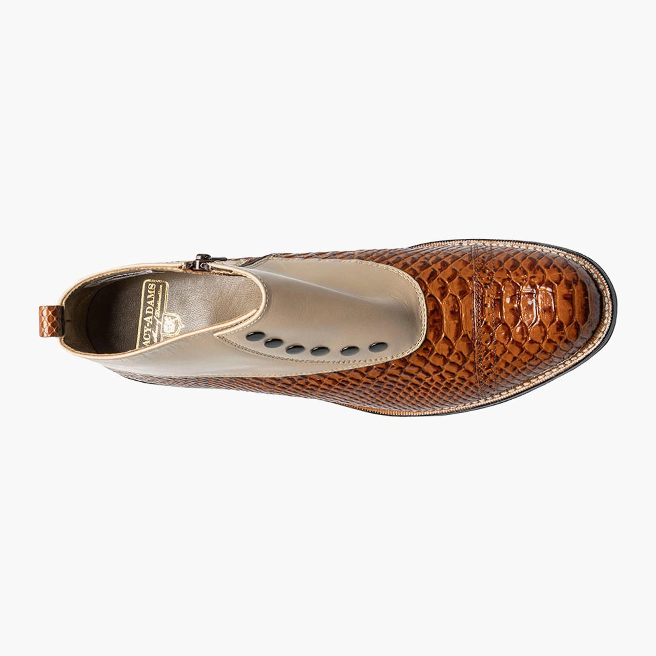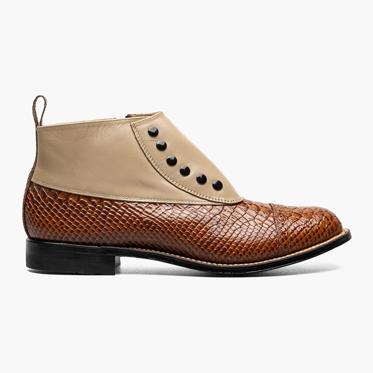The Madison harkens back to an age when style and quality went hand in hand. Featuring a Goodyear welted construction, genuine leather sole, and a soft kidskin leather upper and linings, this two-tone boot with a decorative buttoned spat and size zipper.