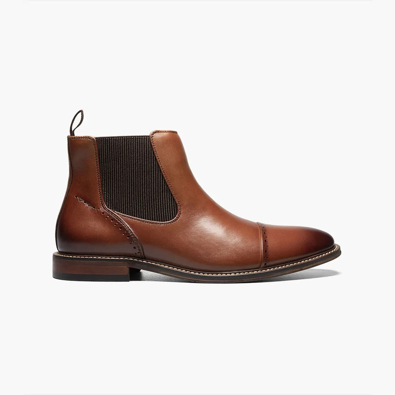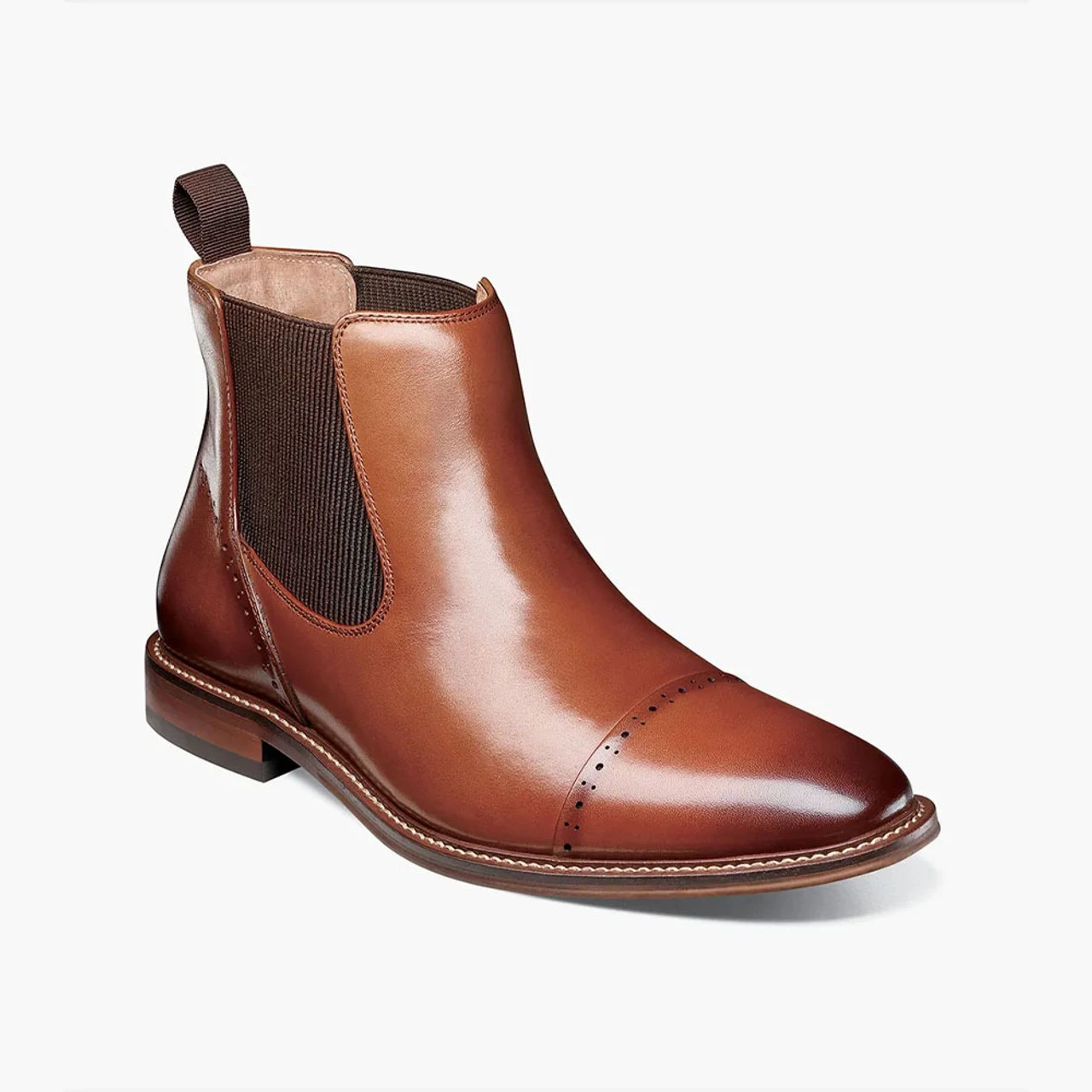 A slip on boot with a perfed cap toe and stacked heel, the Stacy Adams Maury Cap Toe Chelsea Boot is a stylish addition to any collection. Featuring a richly burnished leather upper and stitched welt,