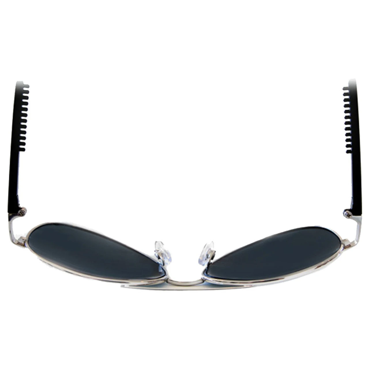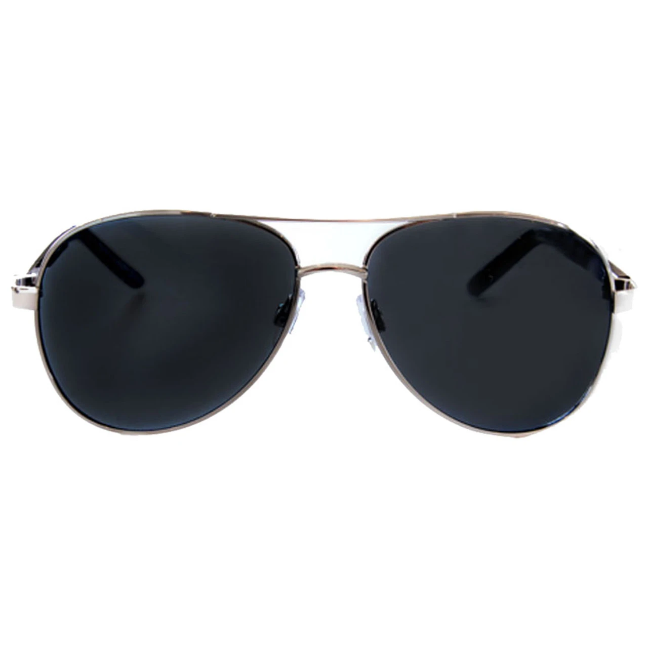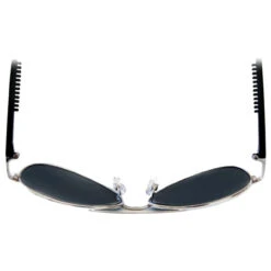 - Frame & Lens: Silver metal frame with smoke lens and black temples